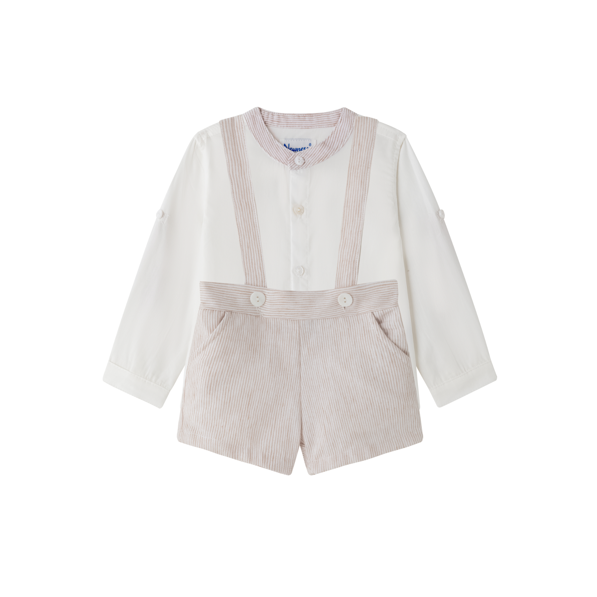 Dress set composed of long sleeve cotton shirt with beige linen details and beige pinochle in linen fabric, with mother-of-pearl buttons.