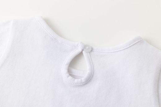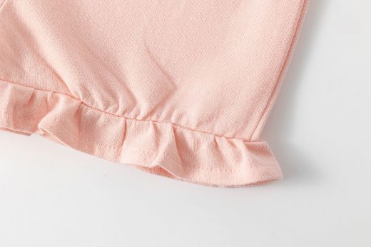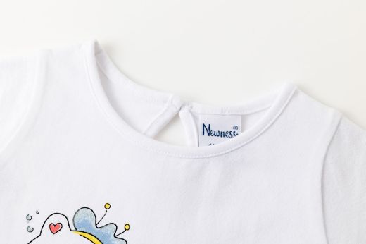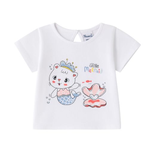 Baby girl's stretch single jersey T-shirt and shorts set. Short-sleeved T-shirt with a water-based print in the center and elastic and button closure at the back. Shorts with an elastic waistband and a gathered ruffle at the hem.