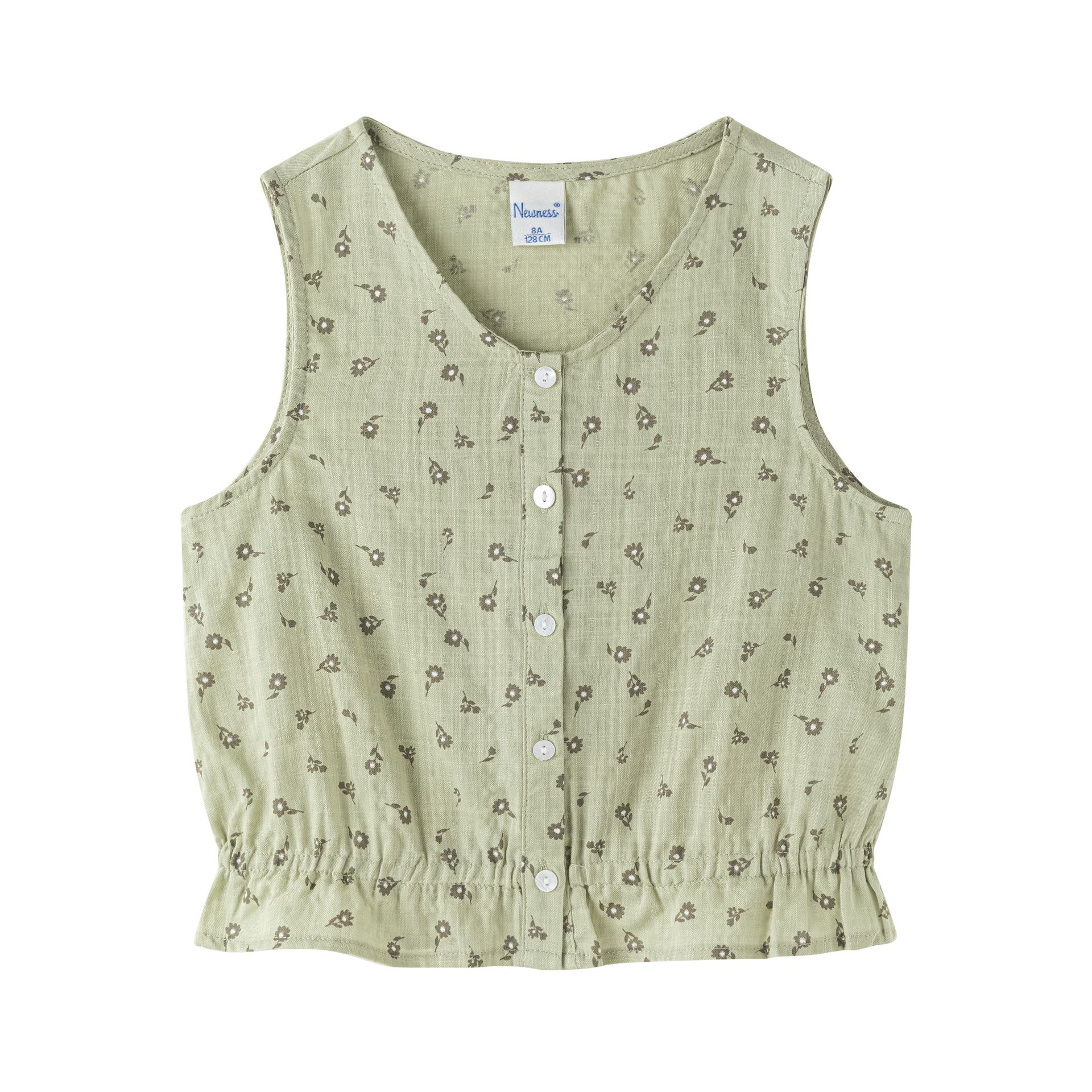 Girls’ sleeveless blouse with elastic waistband in green printed fabric, Safari World collection