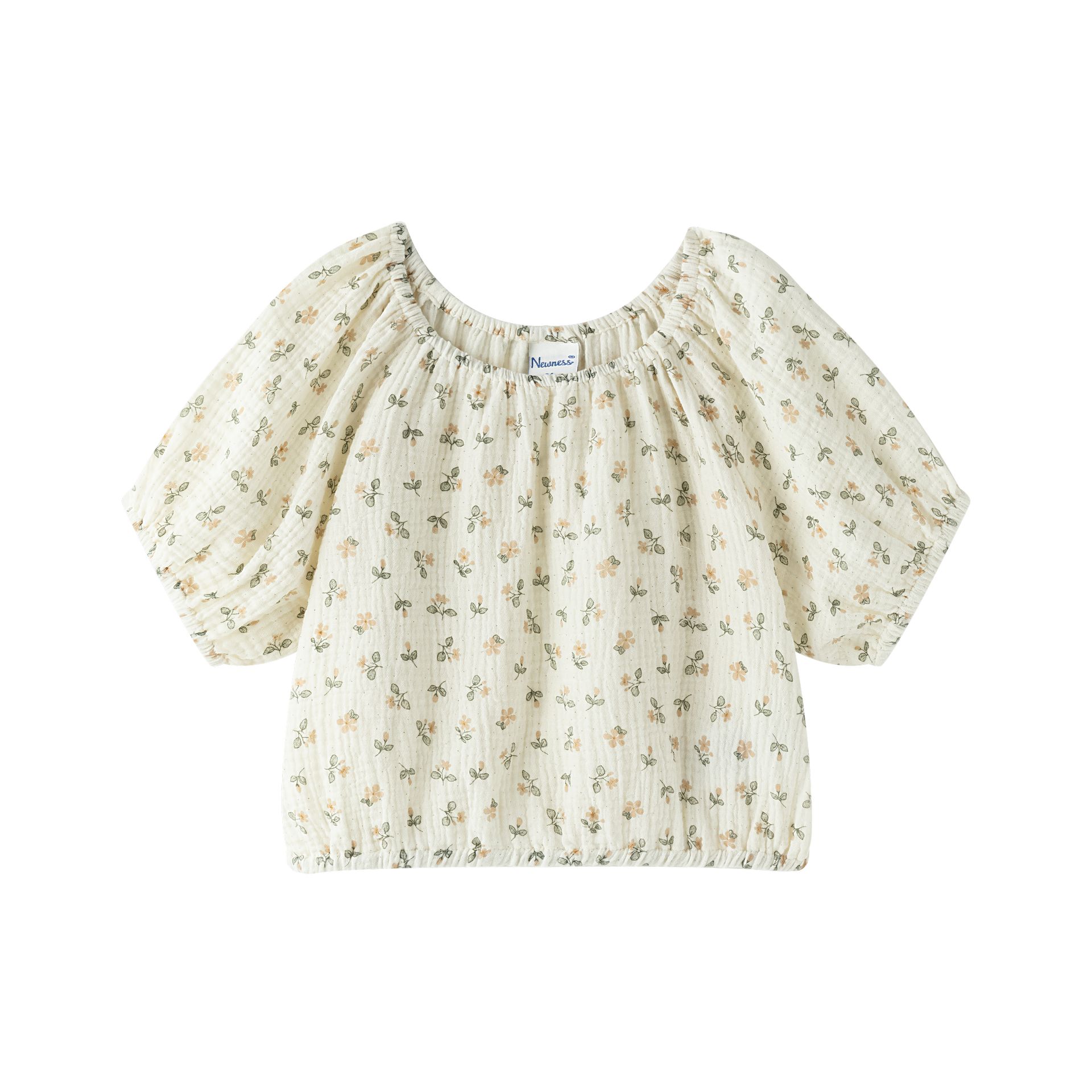 Girls’ short-sleeve blouse with elastic waistband in green print on beige background, Safari World collection