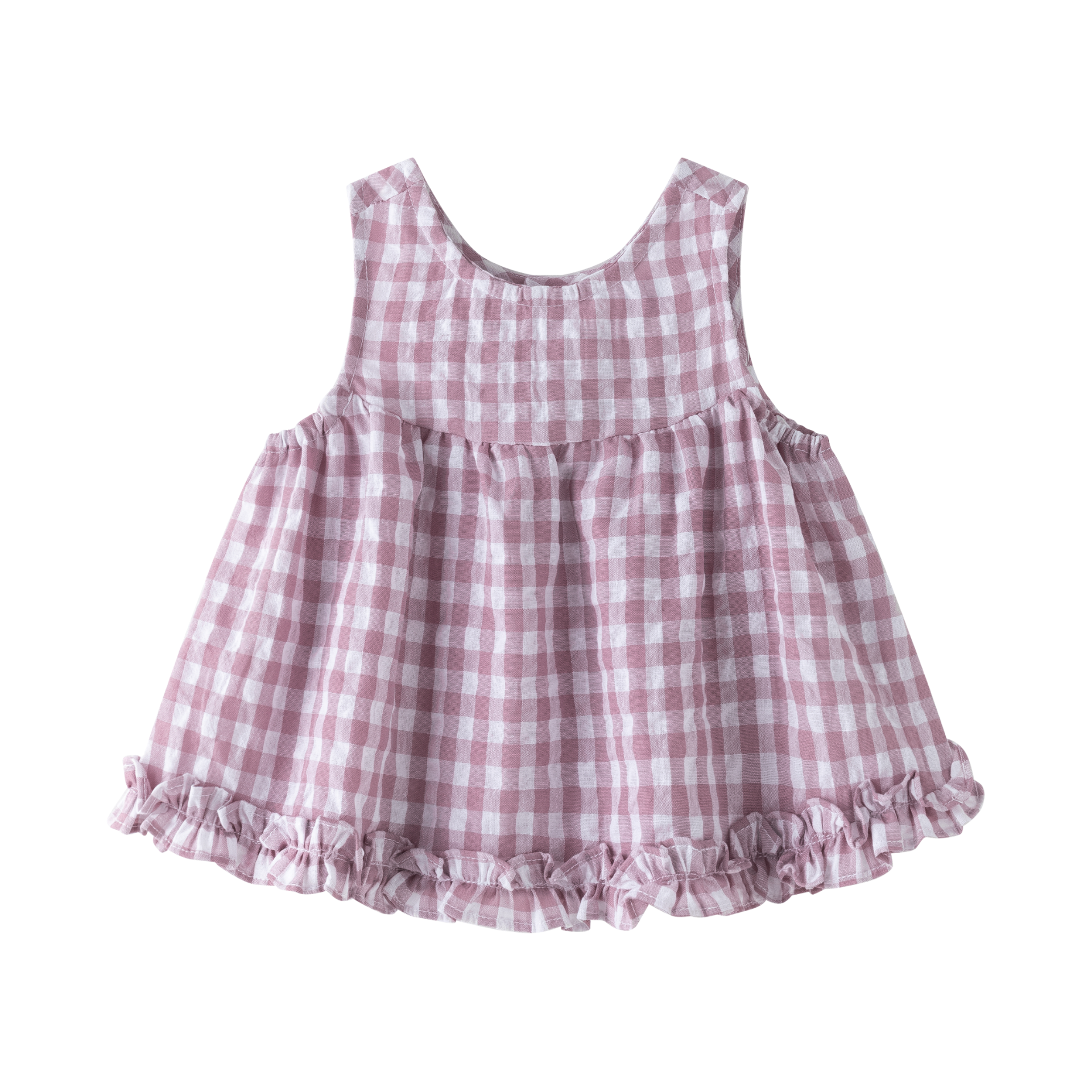 Baby girl blouse with mauve gingham print and small ruffle hem