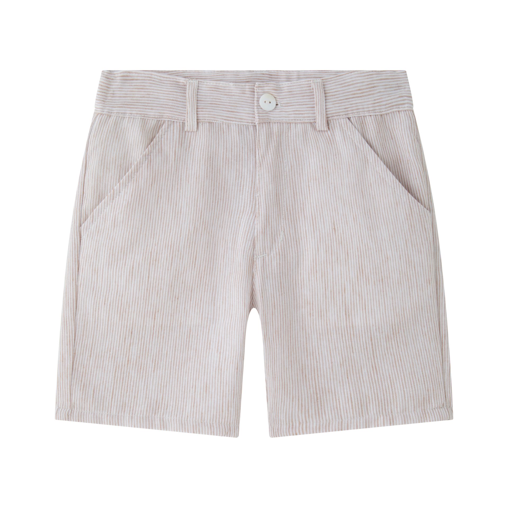 Dressy shorts with side pockets and belt loops. Adjustable waistband and mother-of-pearl button closure.