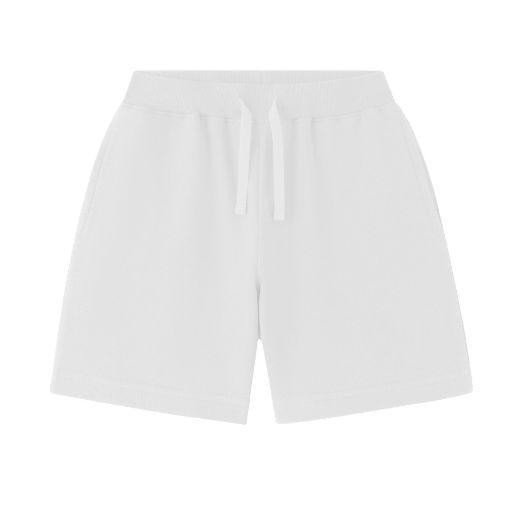 Boys' unbrushed fleece shorts with matching elastic and drawstring waistband. Plain white.