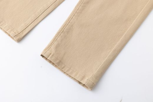 Boys' chino-style jeans with two front pockets and two welt pockets at the back. Beige.