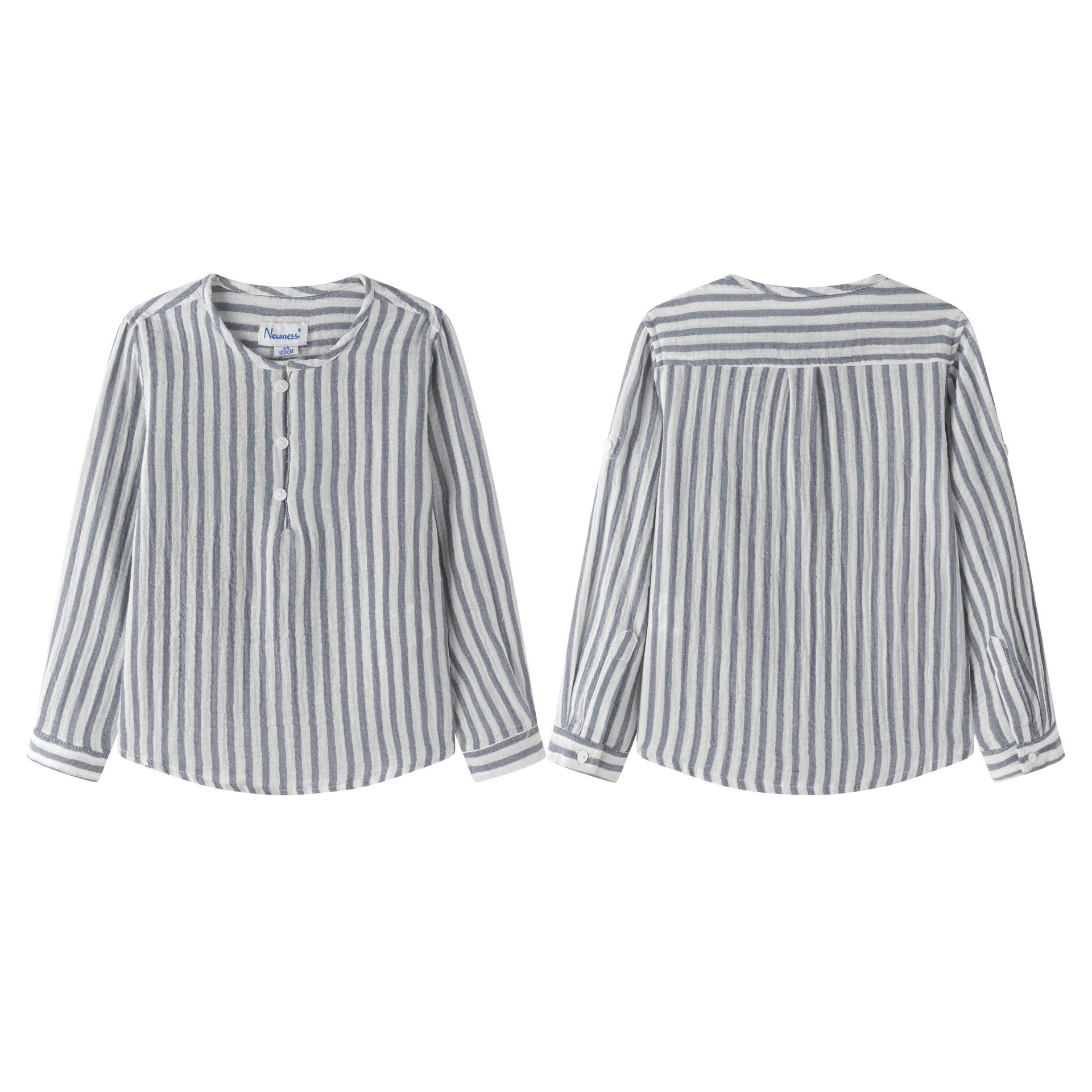 Long-sleeve shirt for boys 3–9Y in bambula fabric with navy blue fine stripes, Surf Old Style collection