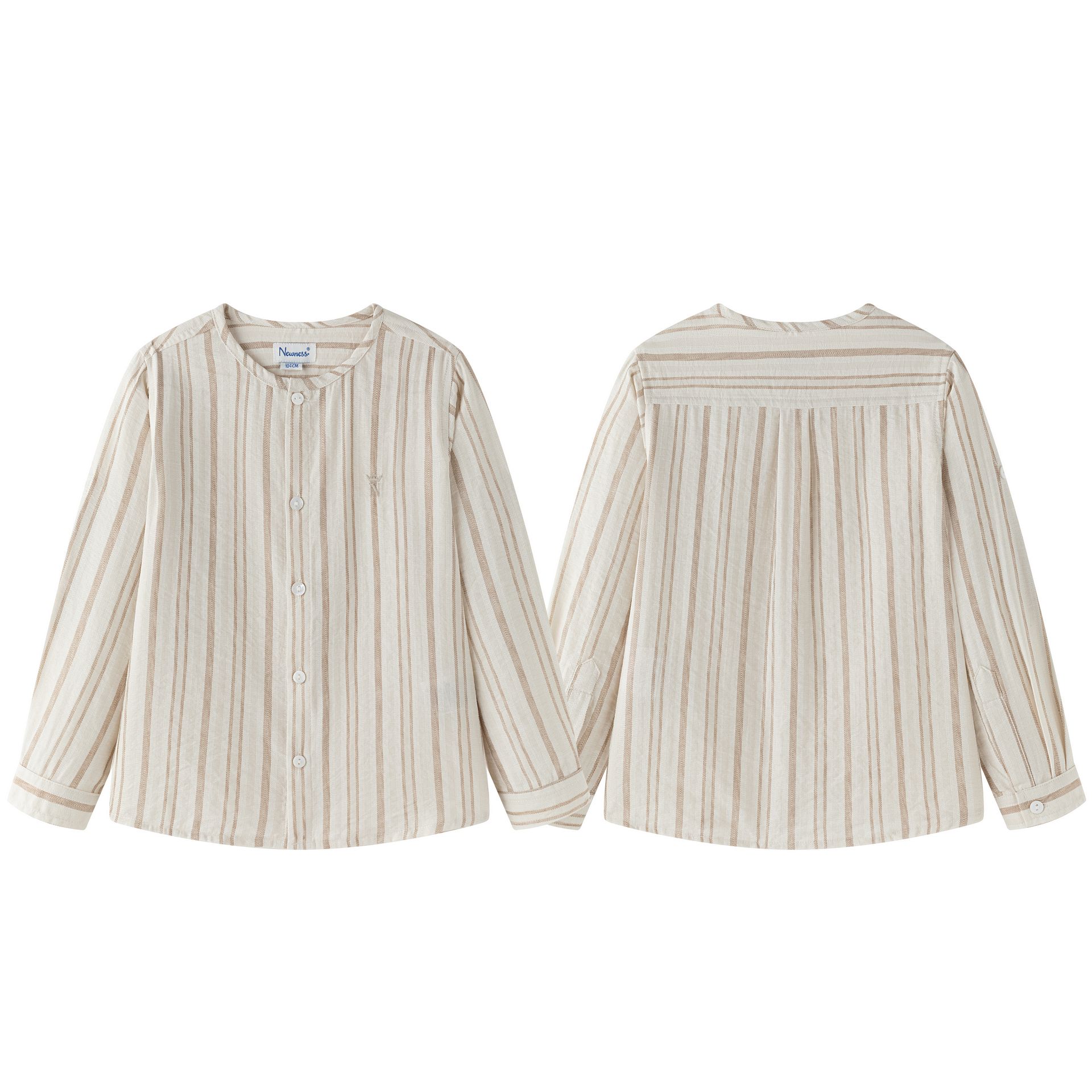 Dress shirt in delicate beige and camel stripes with mandarin collar and camel roll-up sleeve tabs