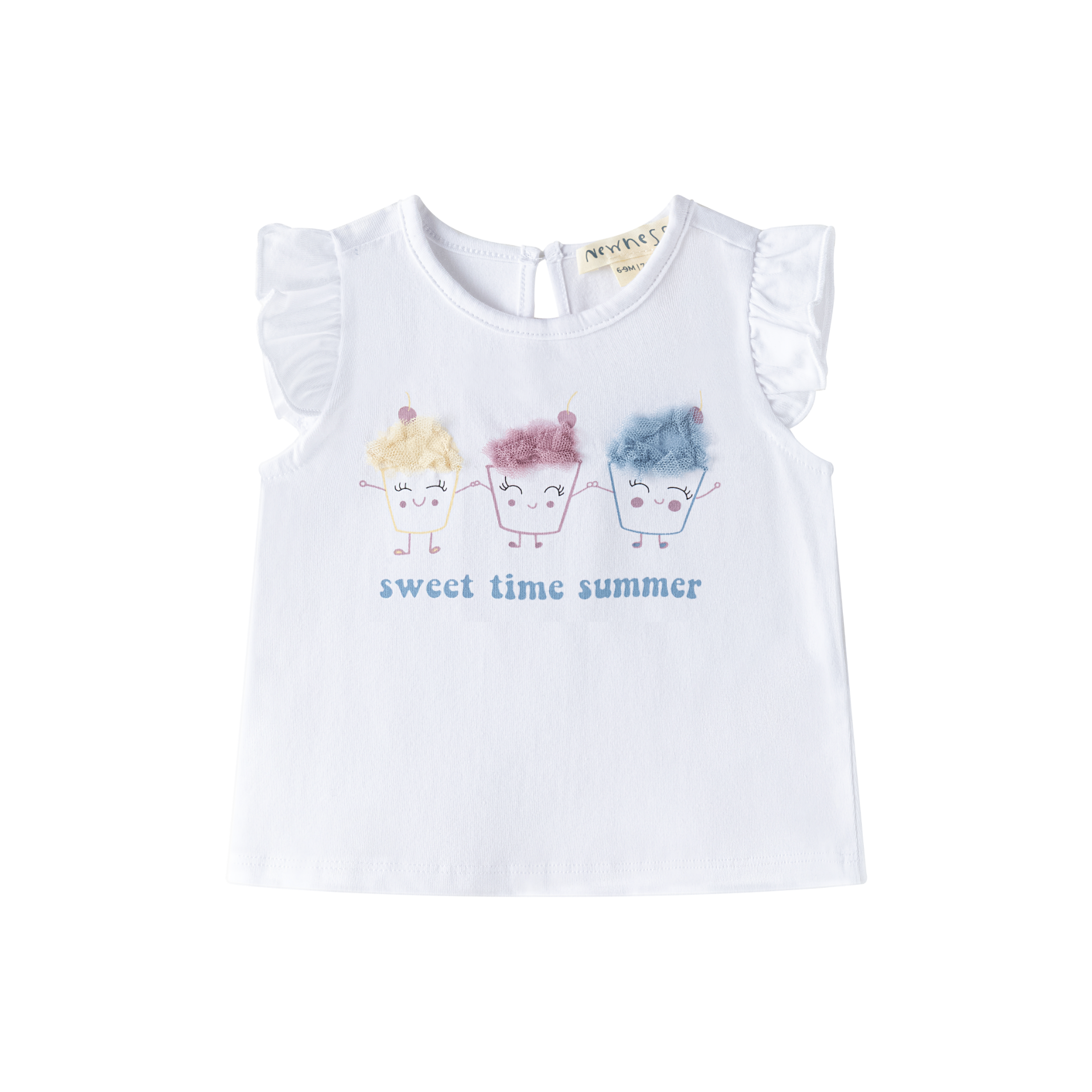 White baby girl T-shirt with ruffled sleeves and central ice cream design with tulle details