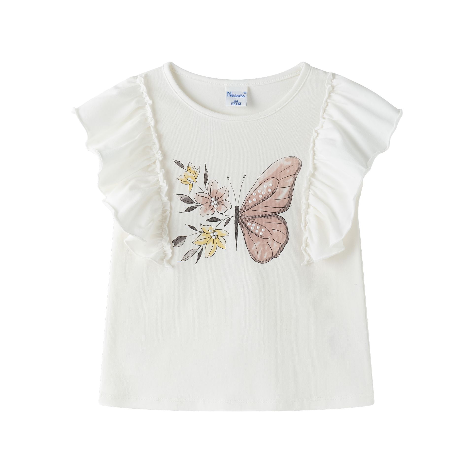 Off-white T-shirt for girls 3–9Y with ruffles and central butterfly design