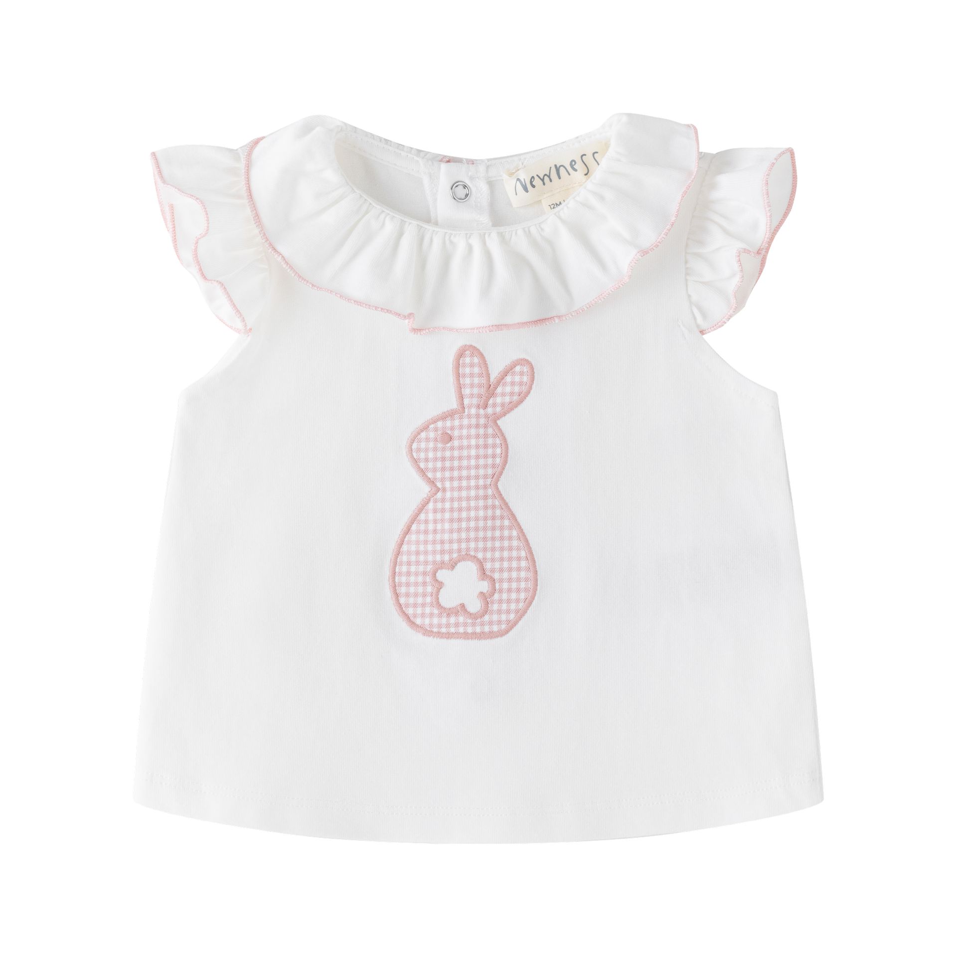 Baby Girl T-shirt for 3–24 months with ruffled collar and front embroidered bunny, made of dusty pink gingham fabric.