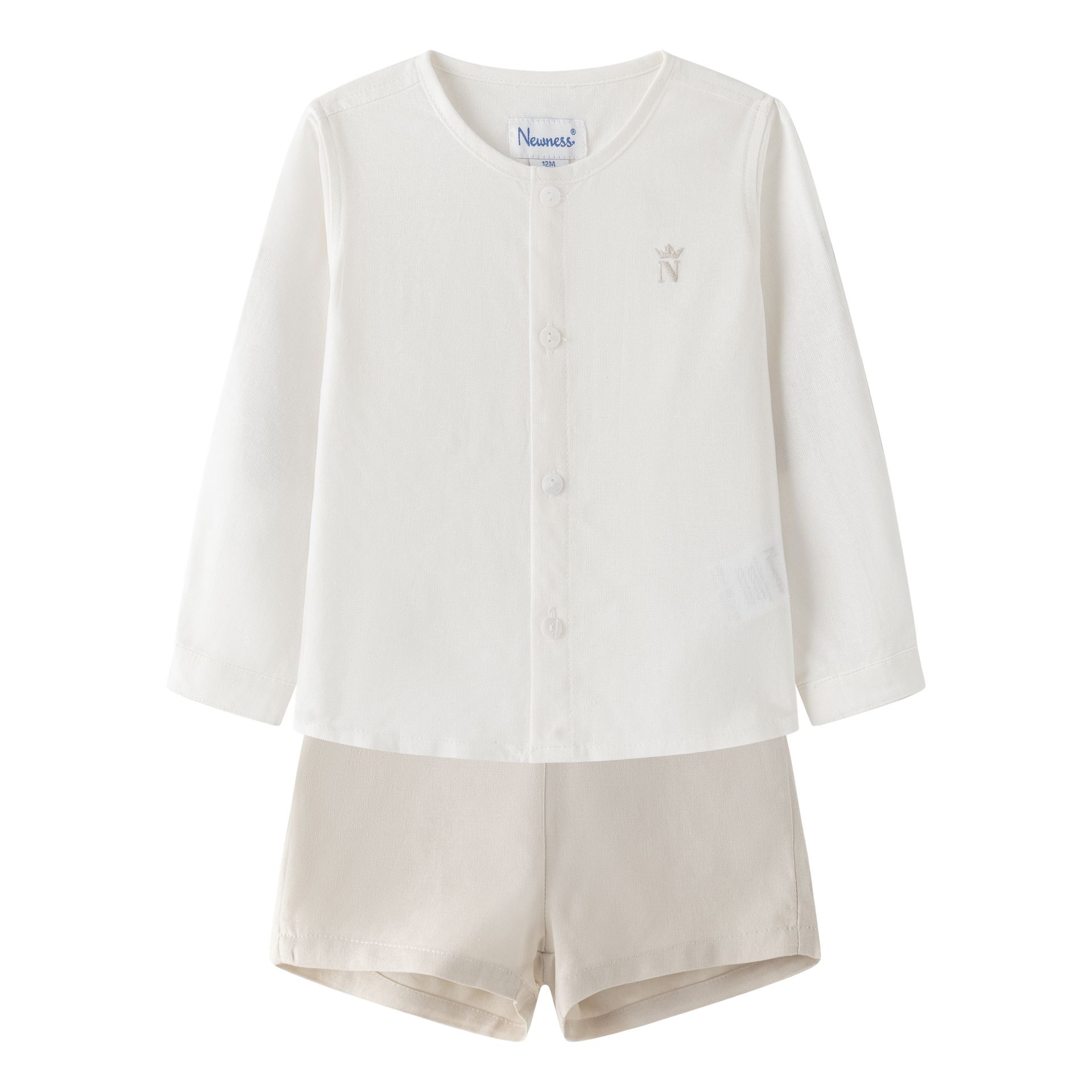 Ceremony baby set 6–24M in white and beige with matching piping on the shirt and adjustable-waist pants for greater comfort