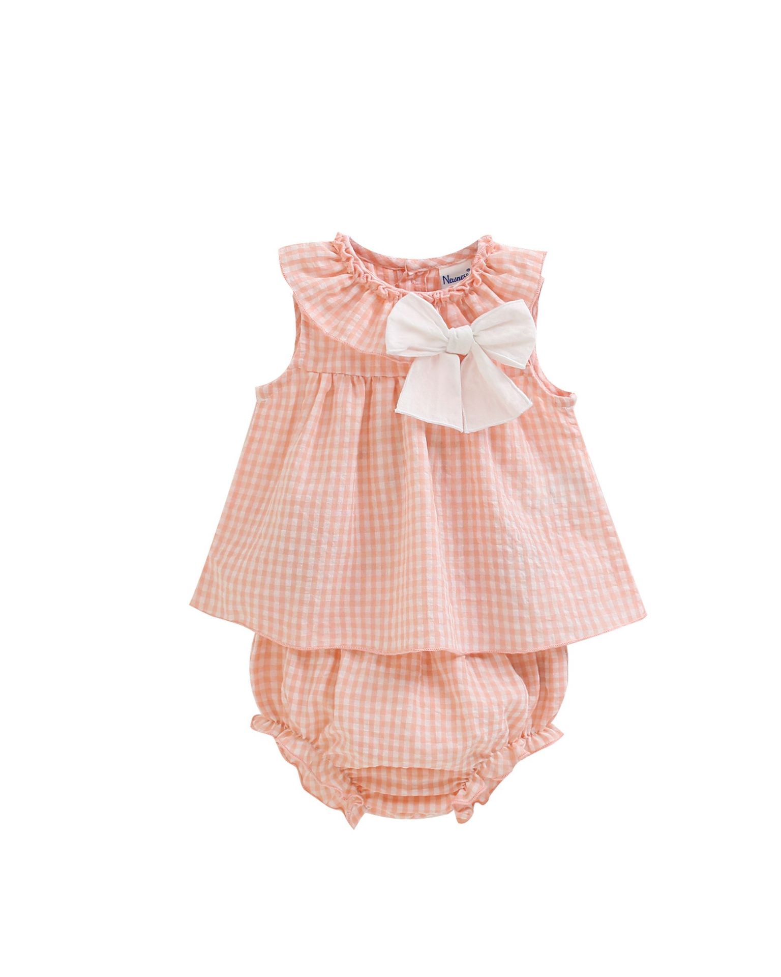 Dressy baby set for 6–24 months in pink plumeti fabric, with round neckline and bow, plus matching romper with bows.