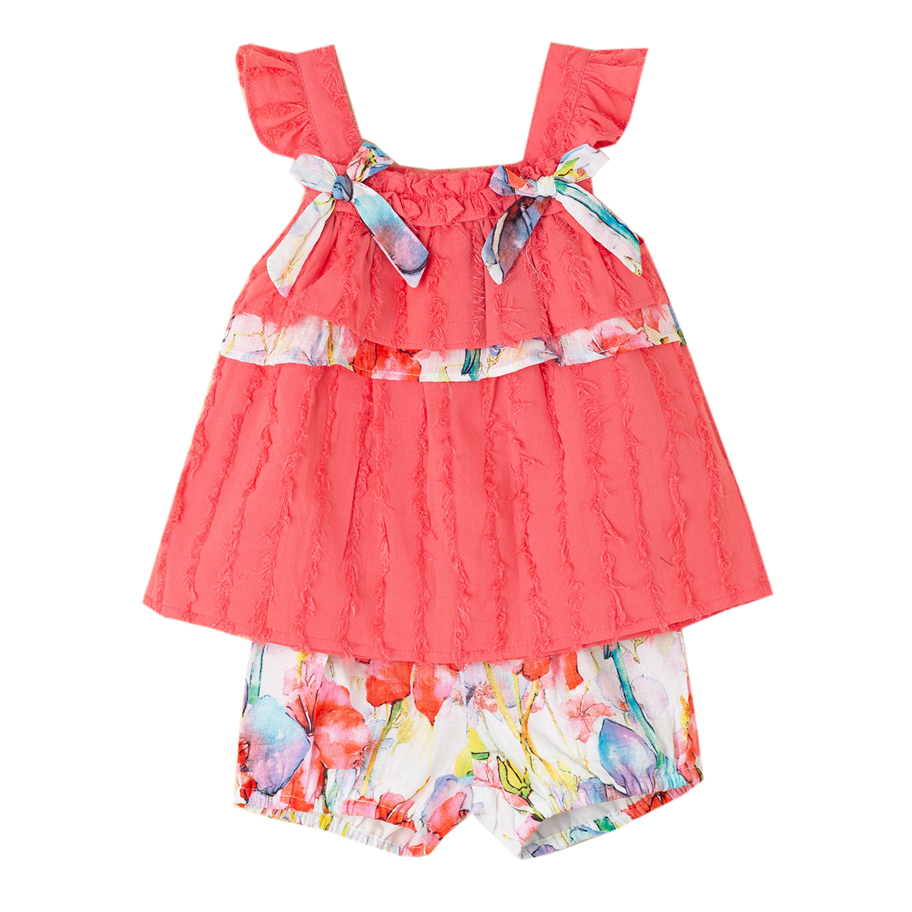 Conjunto Blusa y Braguita, blusa de tirantes con volante a tono, detalle de lazos estampados y volante, braguita estampada con cintura y piernas elasticas.