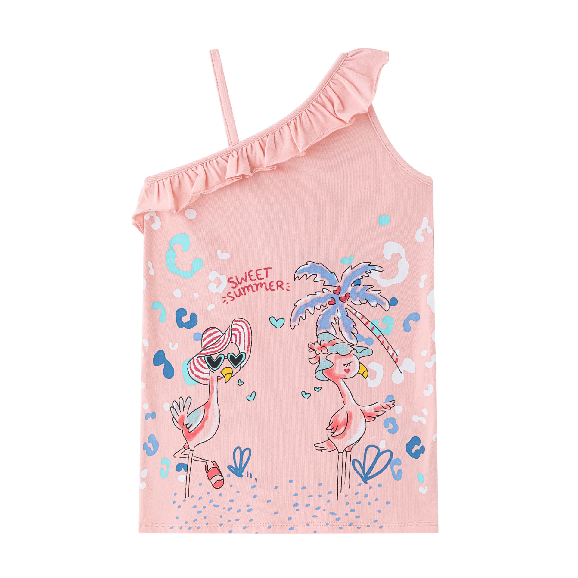 Girls' cotton dress with an asymmetrical neckline and ruffle. All-over water-based print with glitter detailing.