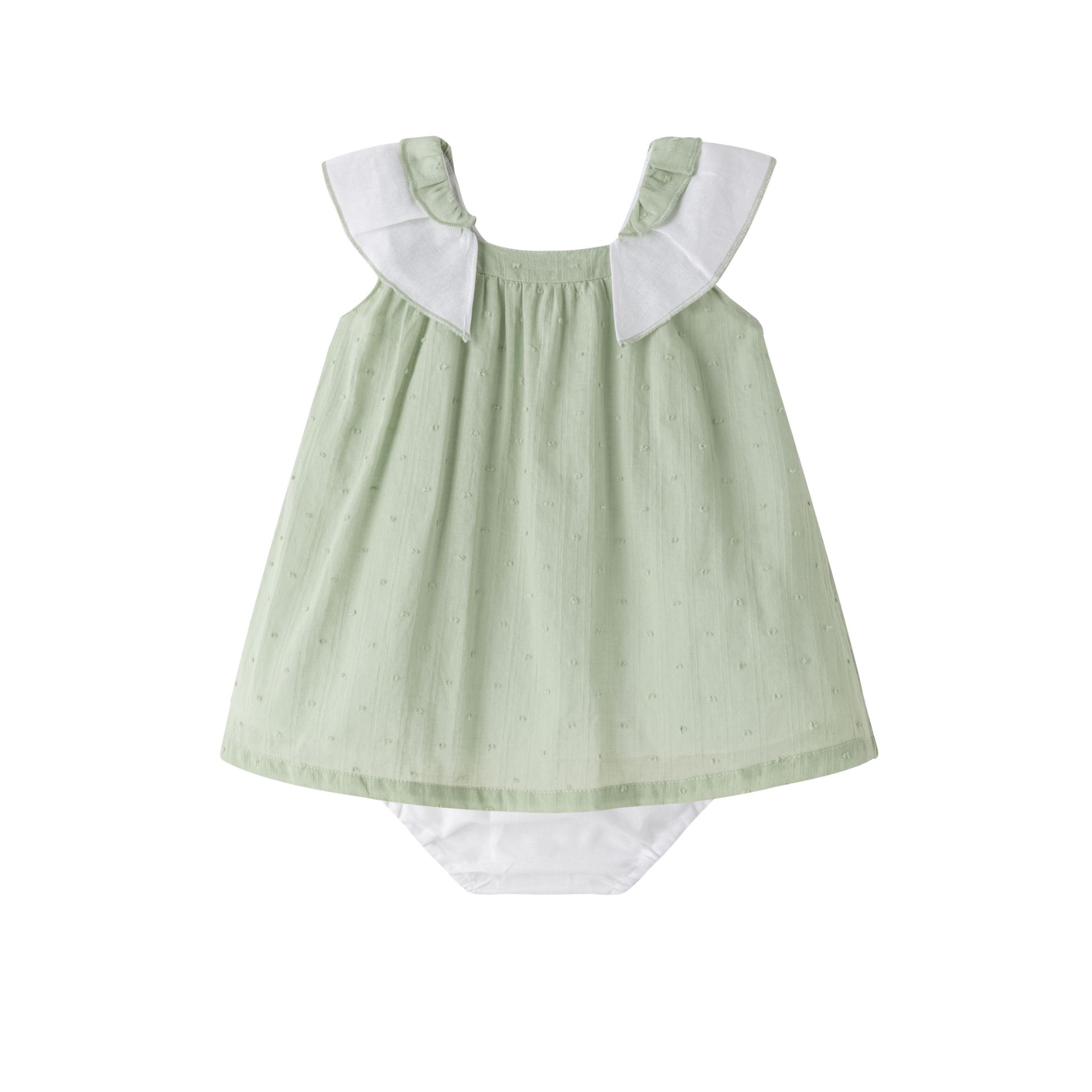 Party dress set with panties. Straps with double ruffle detail. Made of plumeti fabric and inner lining with added tulle. Button closure at the back with a teardrop.