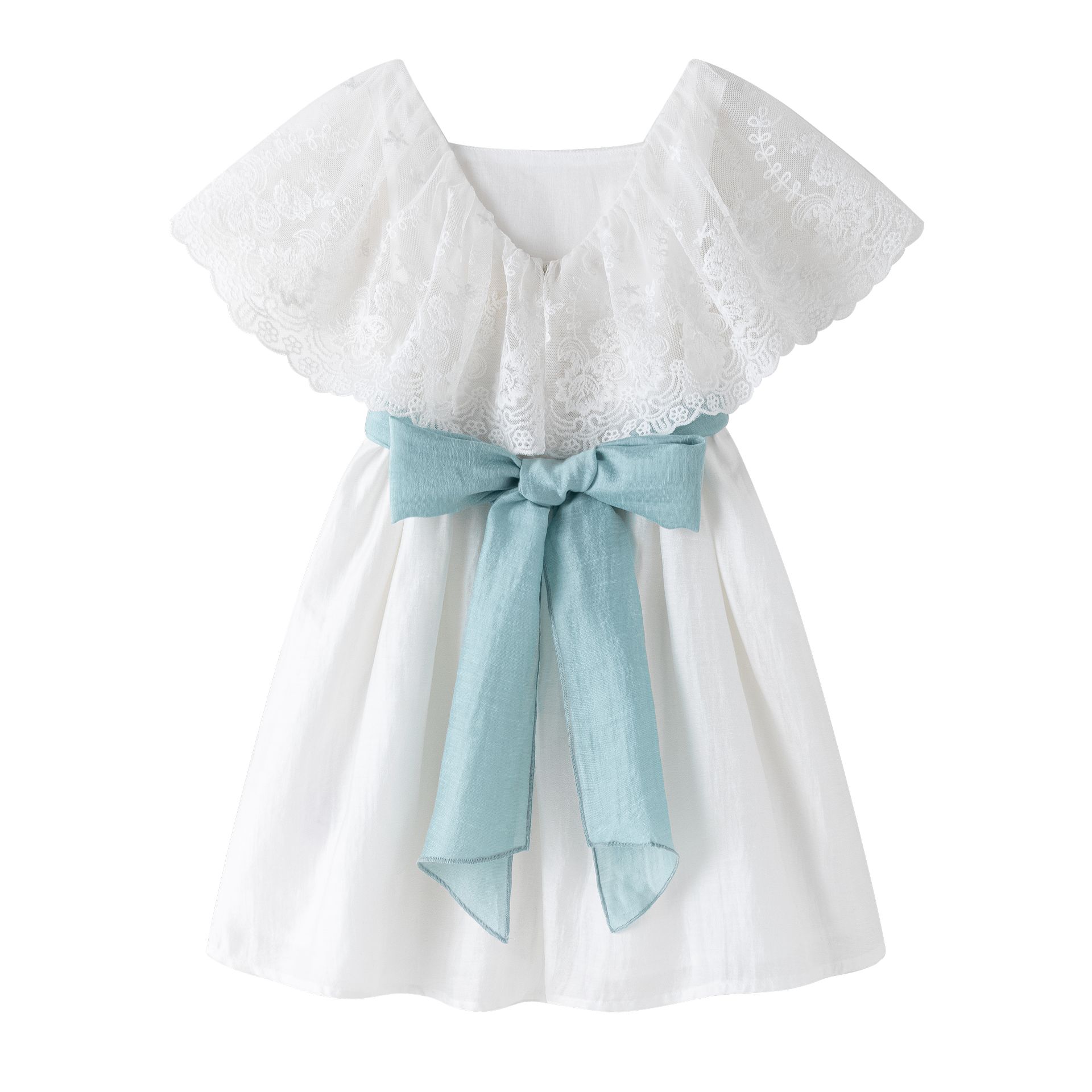 Ceremony dress for girls 3–9Y in treated silk-like fabric with delicate lace sleeves and two matching bows in dusty pink/blue tied at the back