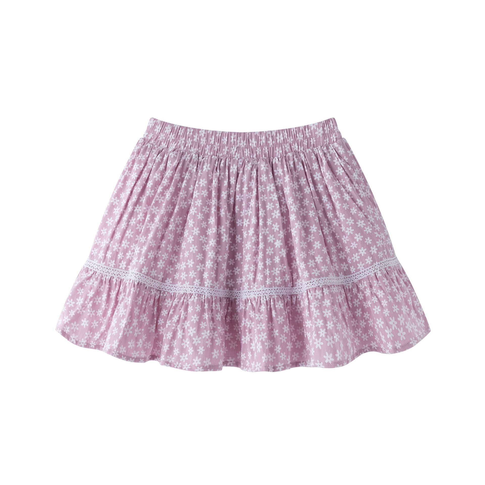 Girls’ skirt 3–9Y in mauve printed fabric with ruffled hem and small lace trim