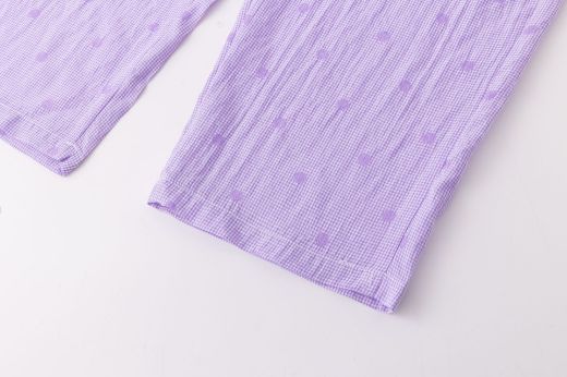 Girls' long jumpsuit with straps and a ruffle. Made from polka-dot printed fabric.