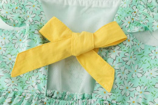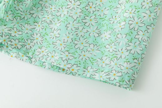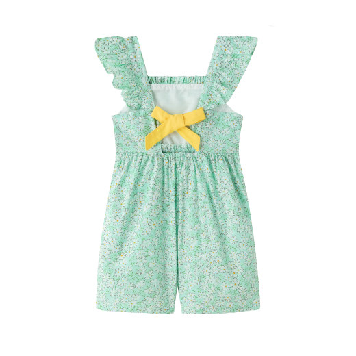 Girls' short jumpsuit with straps and a ruffle. Waistline and wide leg. Made of 100% cotton with a green floral print.