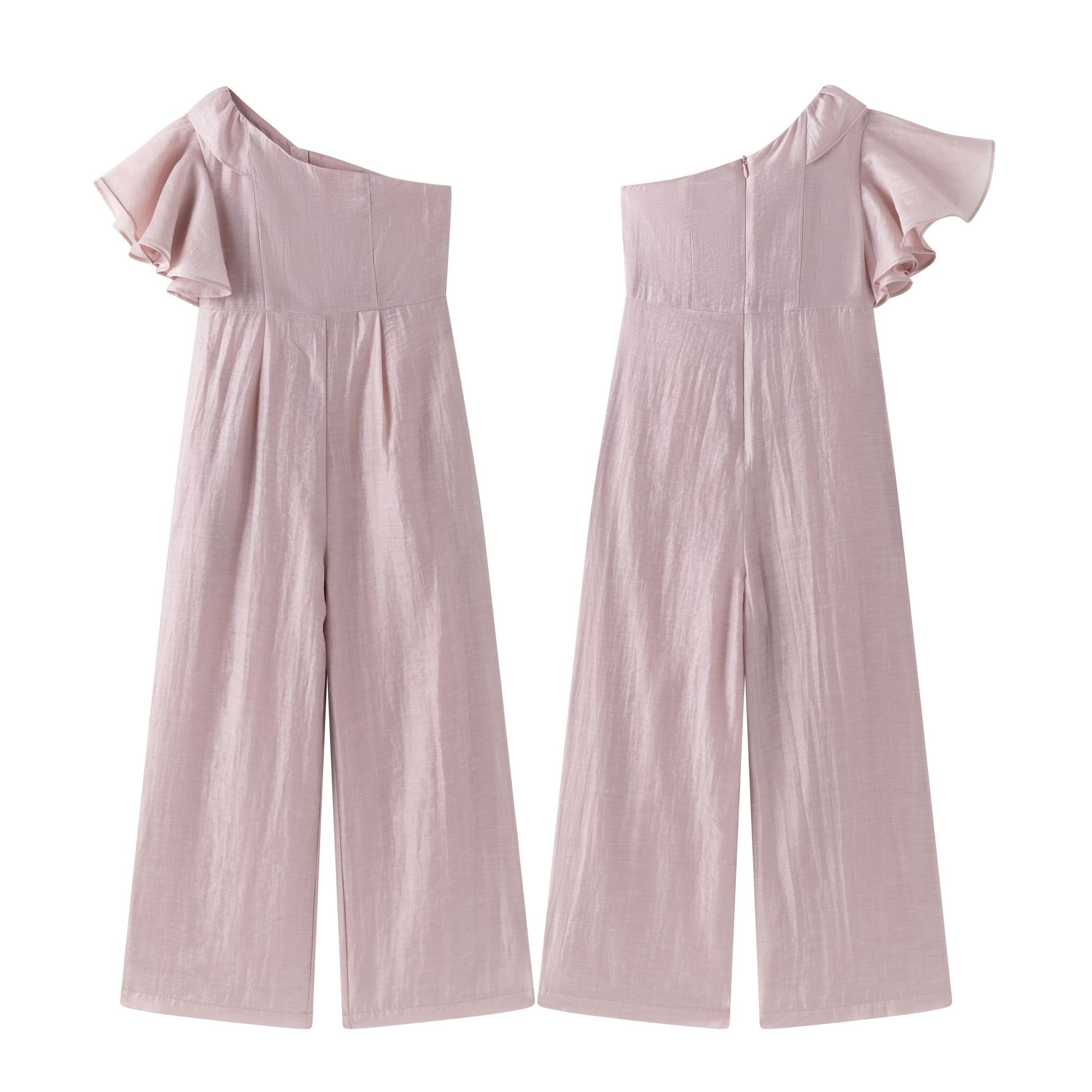 Dressy jumpsuit 7–12Y ideal for ceremonies in treated silk-like fabric, pink, with matching ruffled sleeve and one-shoulder design