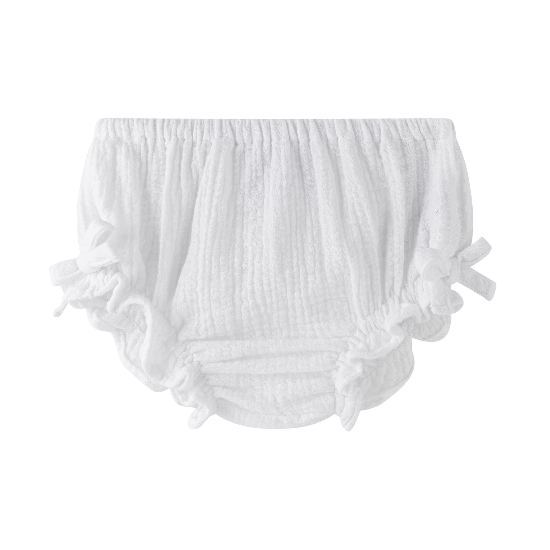 Baby romper for 6–24 months in white bambula fabric, with side bows. Ideal for any combination.