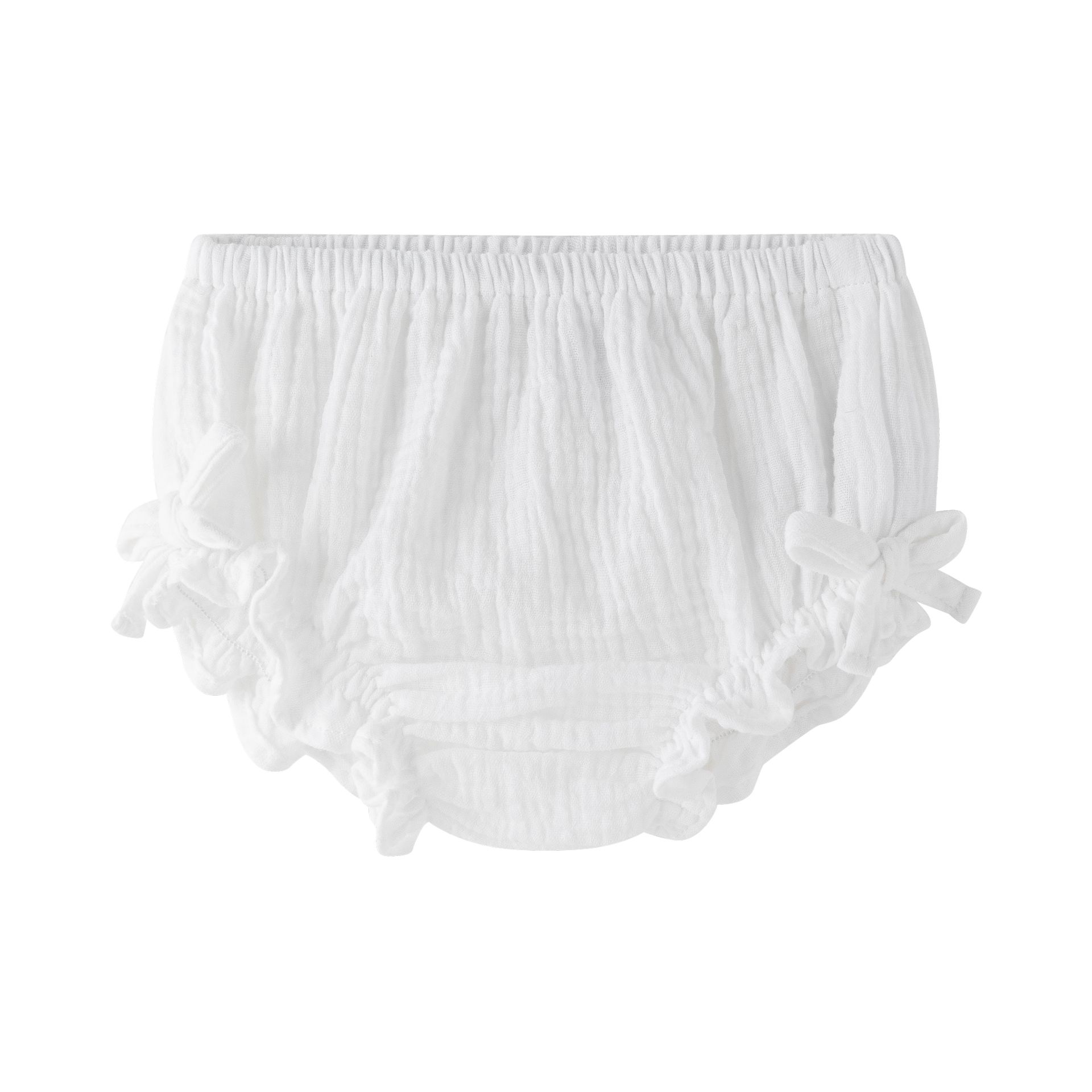 Baby romper for 6–24 months in off-white bambula fabric, with side bows. Ideal for any combination.