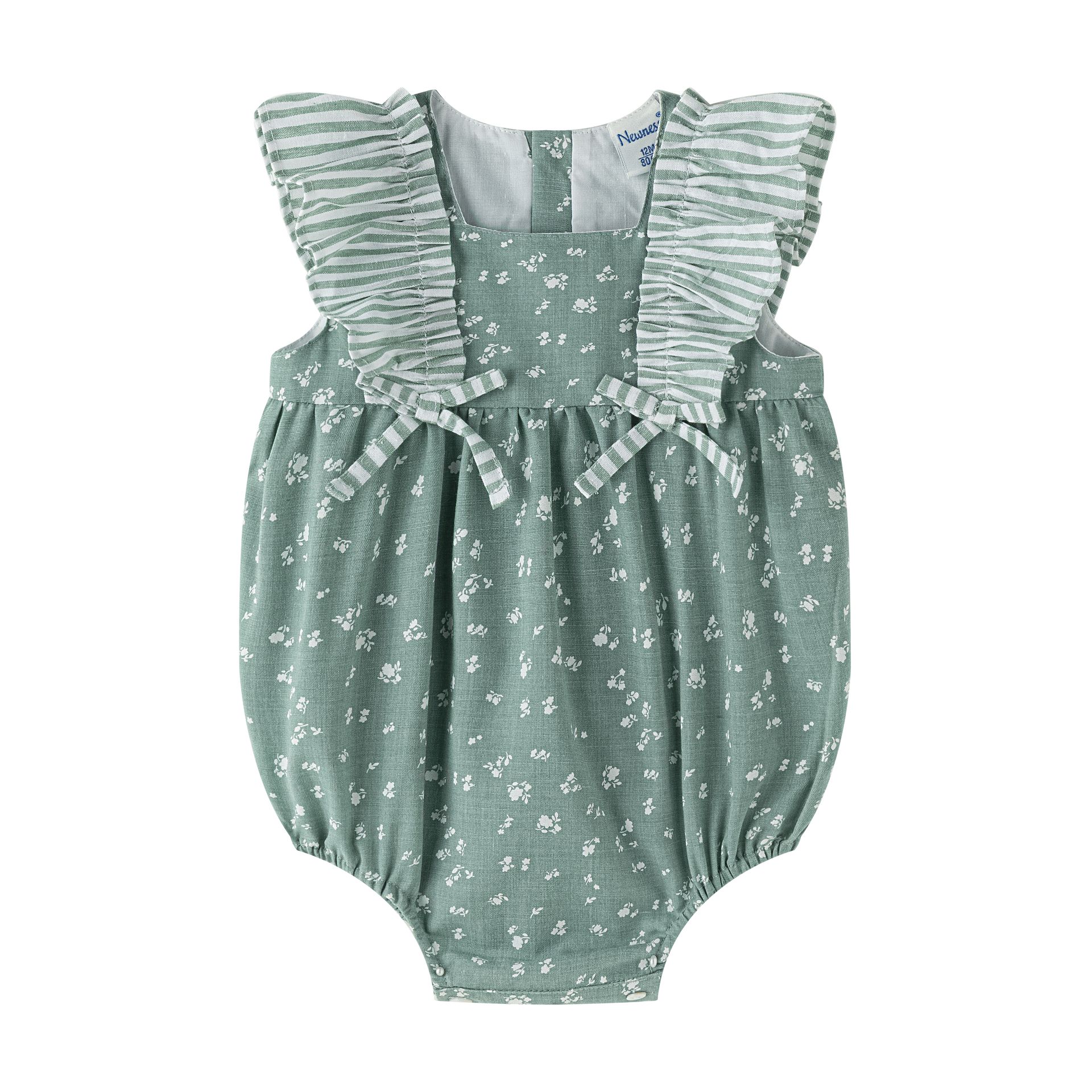 Baby romper for 3–18 months in green and white print, with delicate striped ruffle and front bows.
