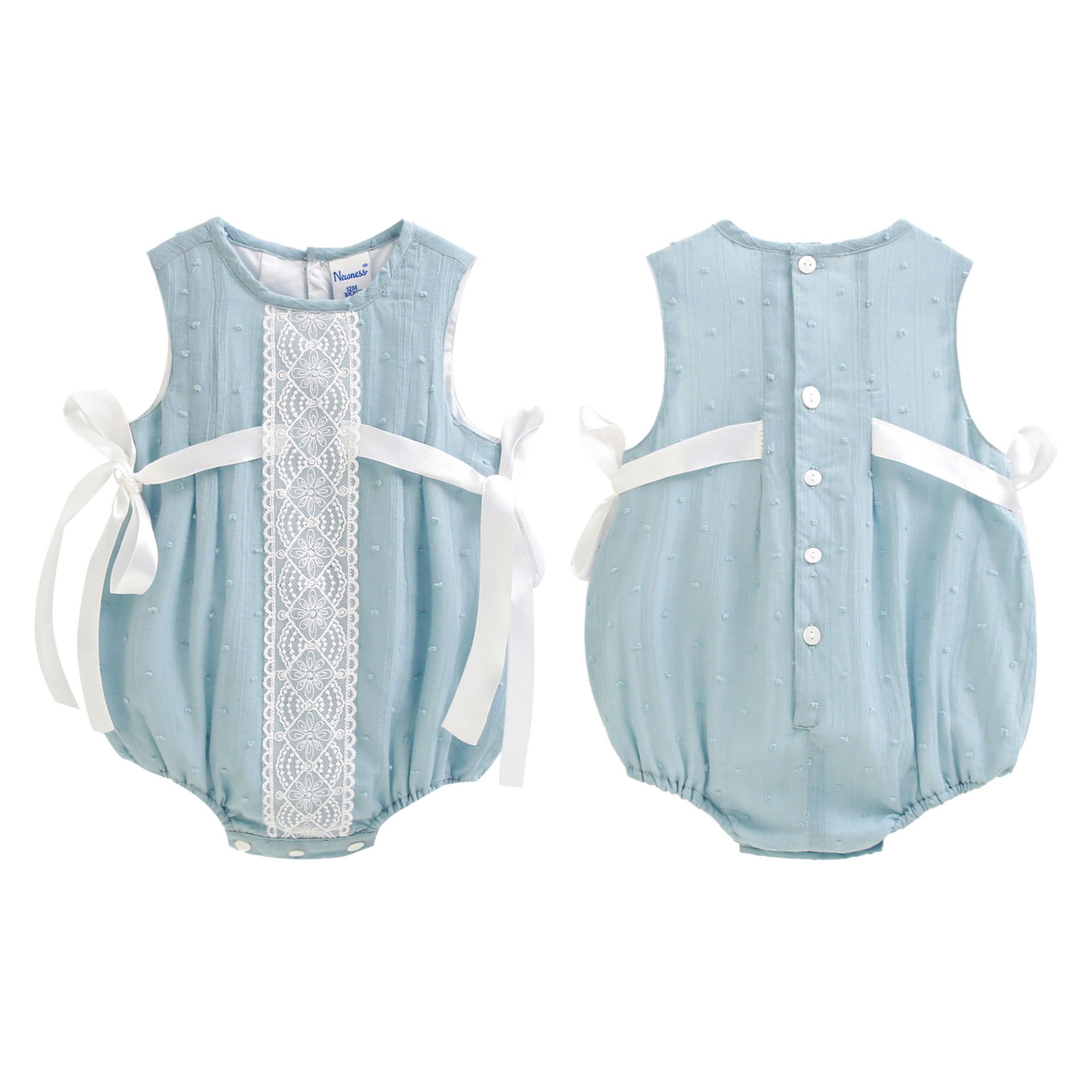 Dressy romper for baby 3–18M in blue plumeti fabric with white side bows and delicate front lace trim (special newborn)