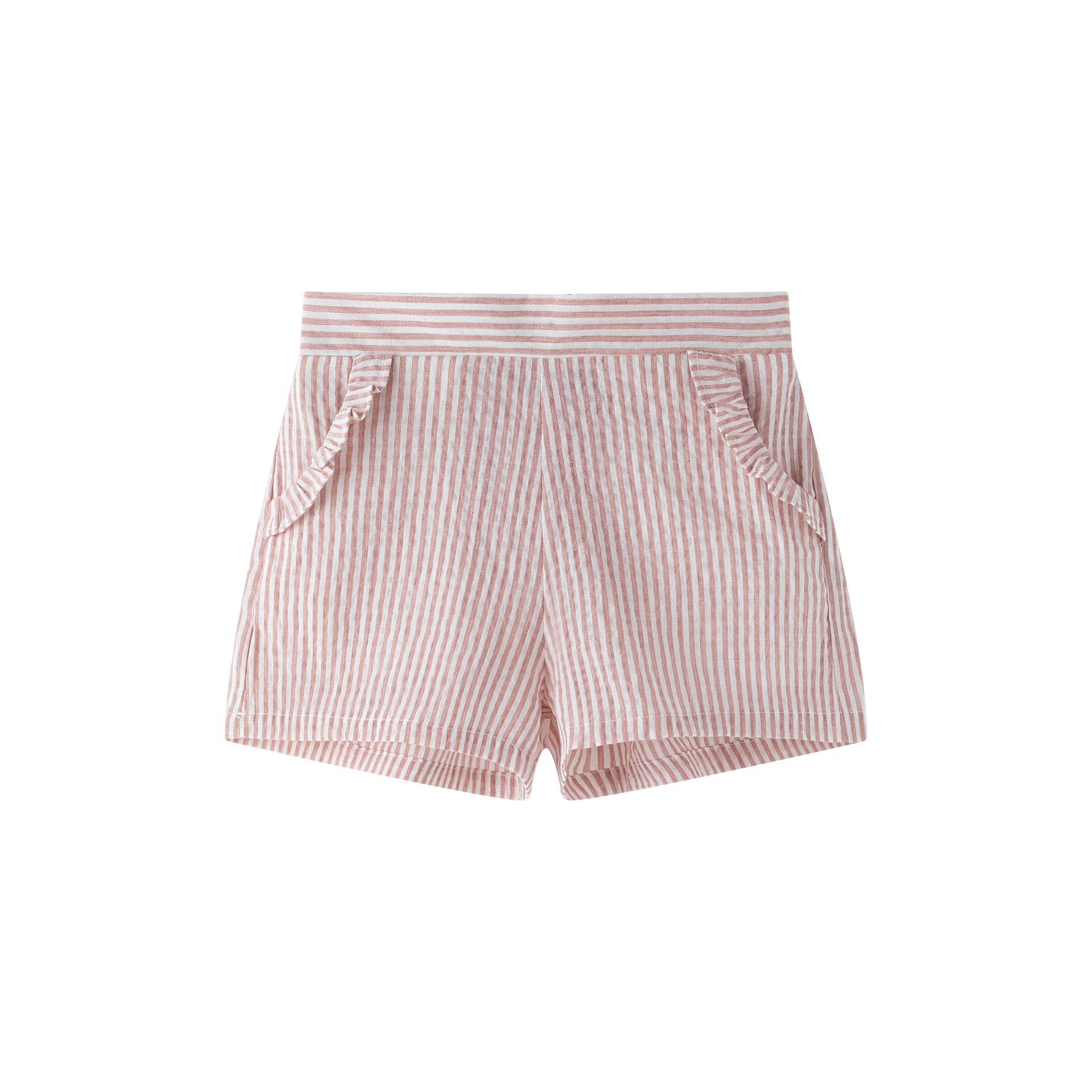 Girls’ shorts 3–9Y in fine pink stripe print with pockets and elastic waistband
