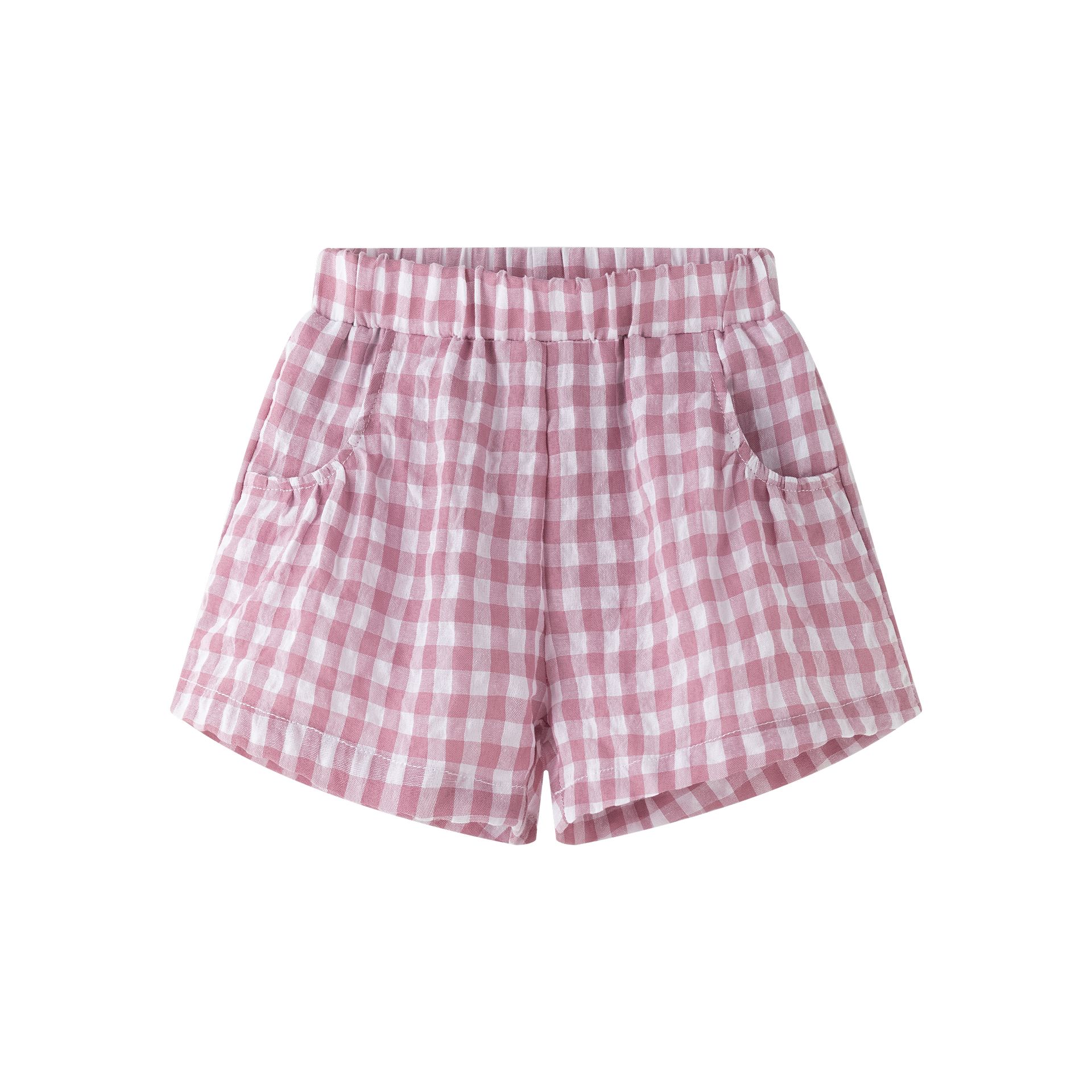 Baby shorts in mauve gingham fabric with elastic waistband and pockets