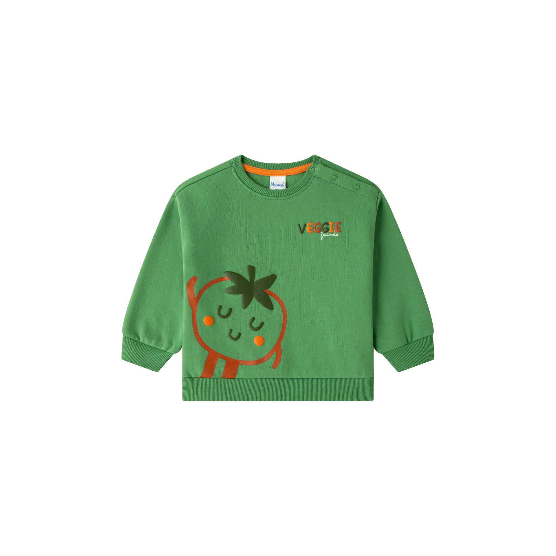 Sudadera de bebe niño, cuello caja y hombros caídos. Felpa perchada. Gráfico de tomate y letras, estampado al agua con detalles en relieve. Abertura de corchetes en hombro.