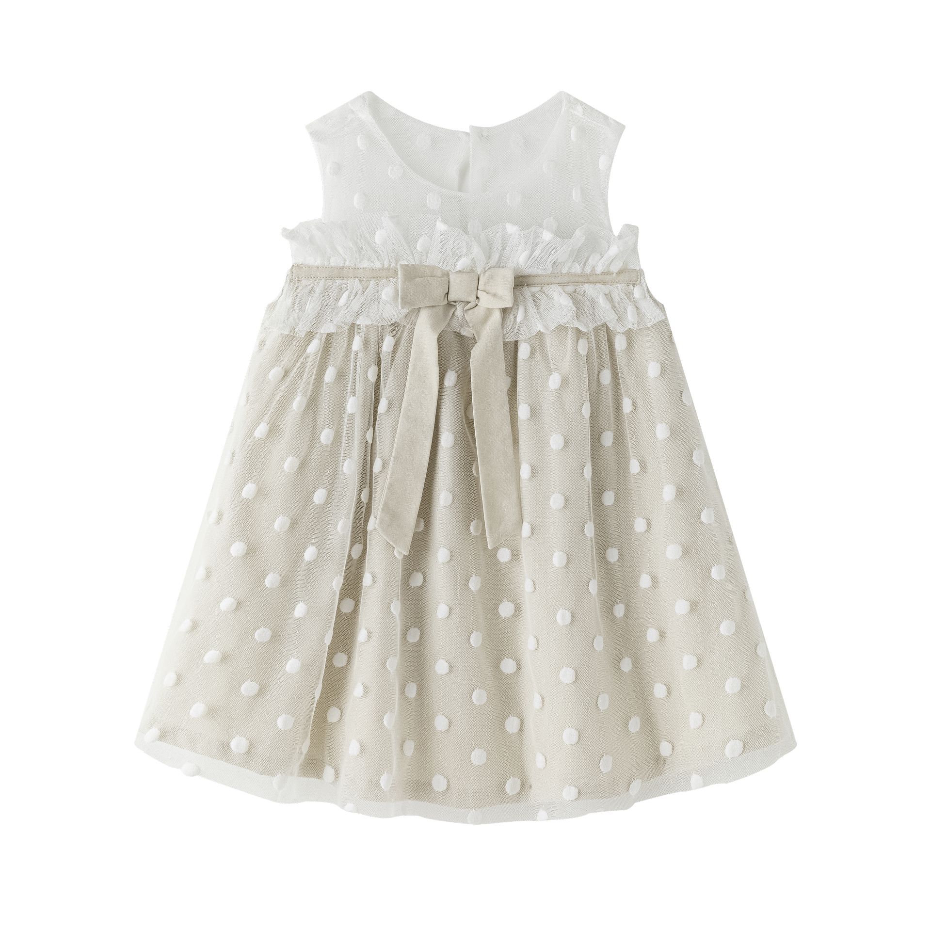 Special ceremony dress for girls 3–9Y in beige with double white polka-dot tulle lining and matching front bow