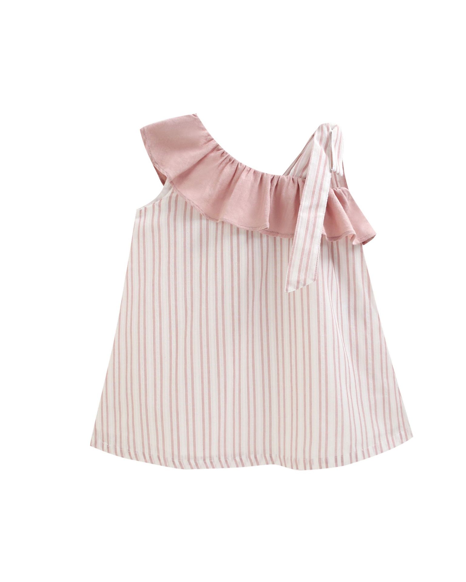 Girls’ dress 3–9Y in striped printed fabric with dusty pink ruffle and matching bow straps