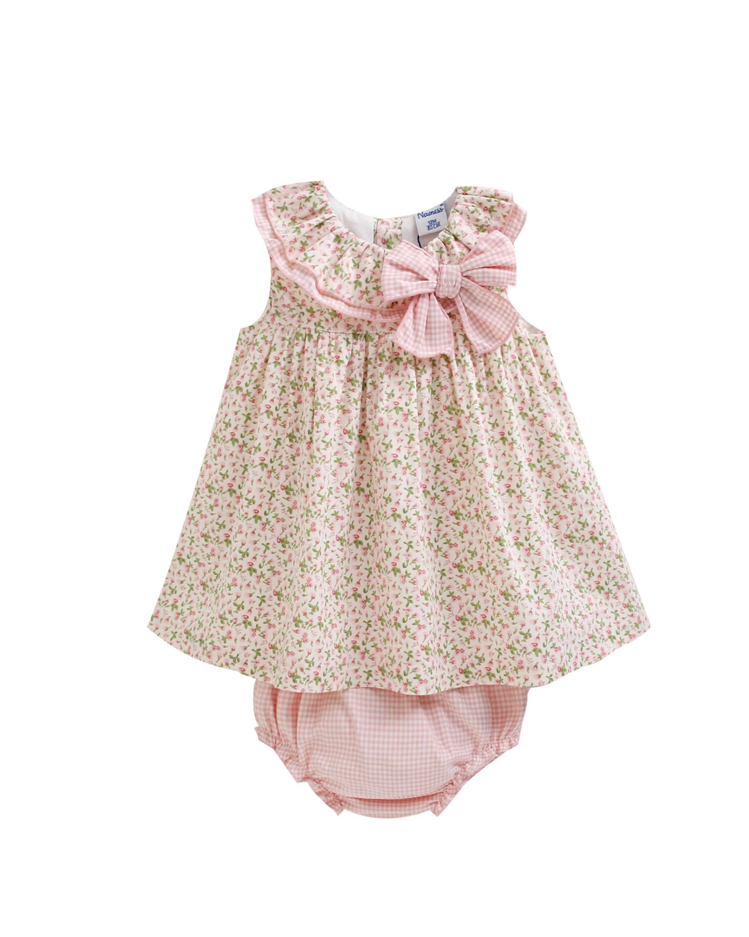 Dressy baby dress for 6–24 months in cotton fabric with Liberty print, featuring a round neckline with matching bow and diaper cover bloomer.
