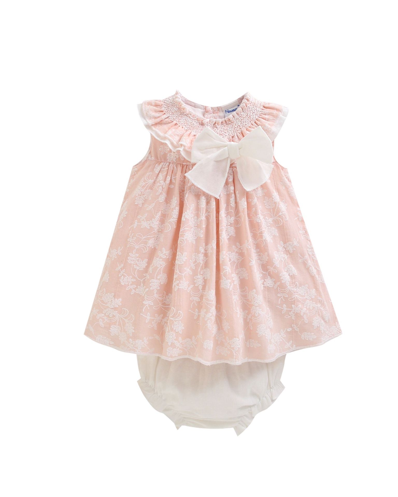 Dressy baby girl dress for 6–24 months in pink, with smocked collar and white patterned fabric, including matching diaper cover bloomer.